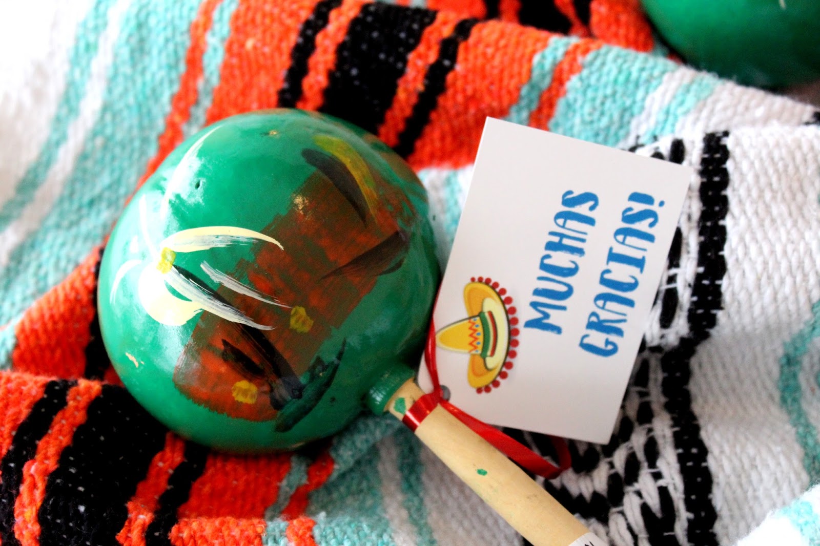 The whole party theme originated from the birthday mom finding a taco piñata in her closet - who doesn't have one laying around? It's a life necessity. That's her life motto and I'm sticking with it! Plus, everyone loves a good fiesta. The taco piñata made for a fun activity for the party guests. They also played Pin the Tail on the Donkey - party classic. For the party favors, I ordered some authentic maracas and tied on fun thank you tags. We laid them out on a festive blanket she gave us to use for decor.